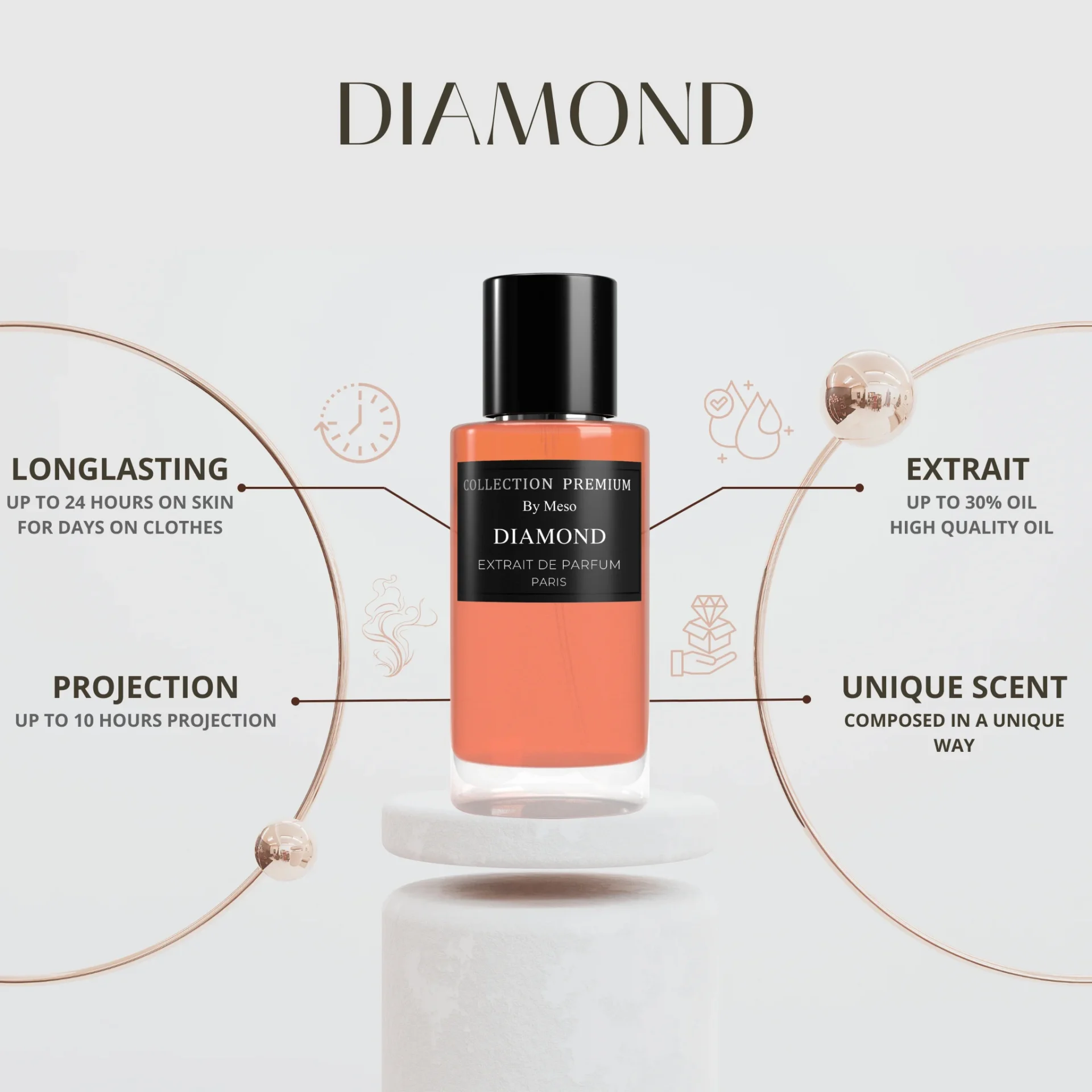 Collection Premium Parfum – Diamond opent met een sprankelende combinatie van framboos, neroli en Amalfi-citroen, die een frisse en verleidelijke eerste indruk geven. In het hart ontvouwt zich een rijk bloemig boeket van jasmijn, gardenia en sinaasappelbloesem, wat de geur een luxueuze, vrouwelijke elegantie verleent. De basis van patchouli, witte honing en amber creëert een warme, sensuele afronding die lang op de huid blijft hangen.