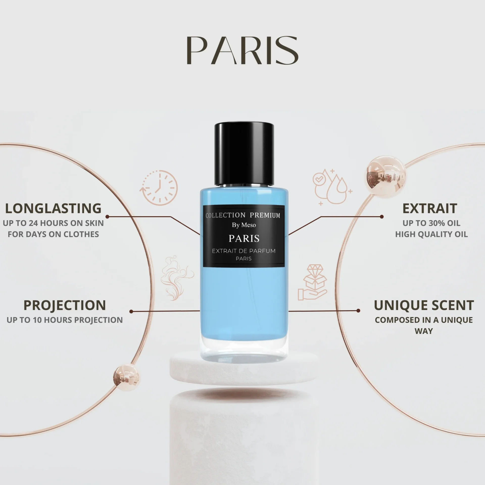 Collection Premium Parfum – Paris opent met frisse topnoten van bergamot, groene bladeren en een vleugje citrus, die direct een levendige en elegante indruk geven. Het hart van de geur onthult subtiele bloemige accenten, die de compositie een verfijnde, lichtzoete dimensie geven. De basis van hout, muskus en zachte amber zorgt voor warmte en diepte, waardoor de geur een langdurige en verfijnde finish krijgt.