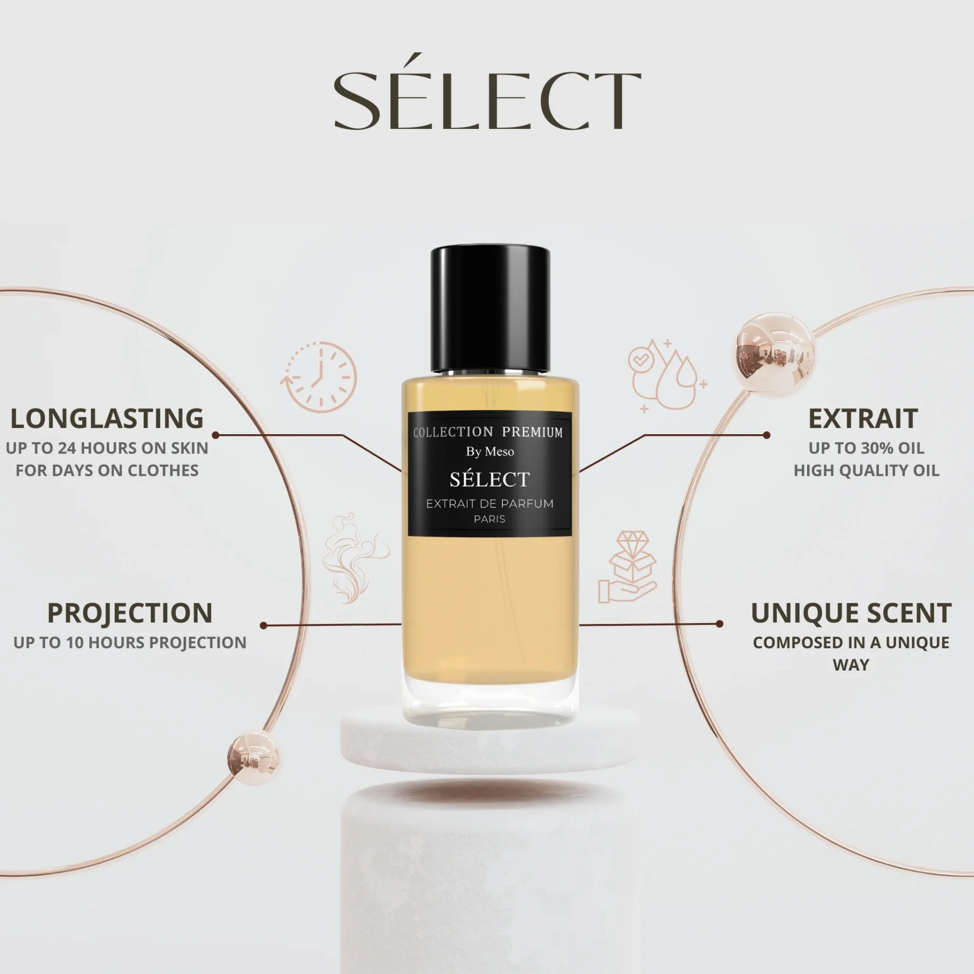 Collection Premium Parfum – Sélect is een luxe herenparfum met een verfijnde compositie van topnoten van mandarijn en scharlei, een hart van karamel en tonkaboon, en een basis van vetiver. Deze geur combineert frisse citrus- en kruidenaroma’s met zoete en aardse tonen, wat resulteert in een sensuele en verfijnde geurervaring.